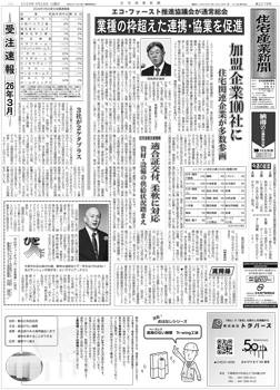 主要住宅企業13社の2026年3月の受注金額速報、3社が2ケタプラス/住宅金融支援機構、適合書交付に柔軟に対応=資材・設備の供給状況踏まえ/パナソニックホームズ、性能・デザインを強化した戸建て新商品「NEWカサート」=省エネ性能はGX ZEH対応に/トヨタホーム、施工現場の仮設電力を100%実質再エネ化=環境価値を電力に付与/26年3月の総展来場者組数=4ヵ月連続マイナスに/26年3月の受注詳報=大和ハウスの請負が好調/環境省、積水ハウス・楠氏に感謝状=エコ・ファーストの功労者/国土交通省、住宅関連団体に協力要請=目詰まり特定など、〝受注停止以降大幅な受注増〟に/気象庁、最高気温が40℃以上の日の名称を「酷暑日」に/住宅金融支援機構、「フラット35」とローン選びの解説動画公開/国土交通省水管理・国土保全局下水道事業課、対策要する下水道管〝八潮と類似〟は4割に=下水道管路の全国特別重点調査の結果/国土交通省住宅局住宅総合整備課、「2026年度空き家対策モデル事業」の募集開始/健美家・成瀬亮輔社長に聞く、意思決定を支援するプラットフォームに=物件鮮度にこだわりを/全住協「第16回優良事業表彰」、2部門11ブロックを選出/LIFE QUARTET、「LMコンテスト」開催=〝ナフサショック〟には連携/タカマツハウス「グランミラクラス南麻布」、上質感をコンセプトに計画=販売部門を統合し、さらなる成長目指す/アールシーコア、法人向け事業を刷新=第1弾は「リゾートパッケージ」販売/住設・建材メーカー受注見合わせ増える、中東情勢混迷で「納期未定」や値上げ/PHS、スマホ1台で見積りが可能、「写真deAI積算」/YKK AP、ホームページにPHSコンテンツ掲載、「新しい価値創造」をアピール/コスモスイニシア、「INITIA&Renovation ID」シリーズの公式サイトを刷新/ケイミュー、住宅外観の第2回コンテスト=専門家ではなく〝施主〟が選定